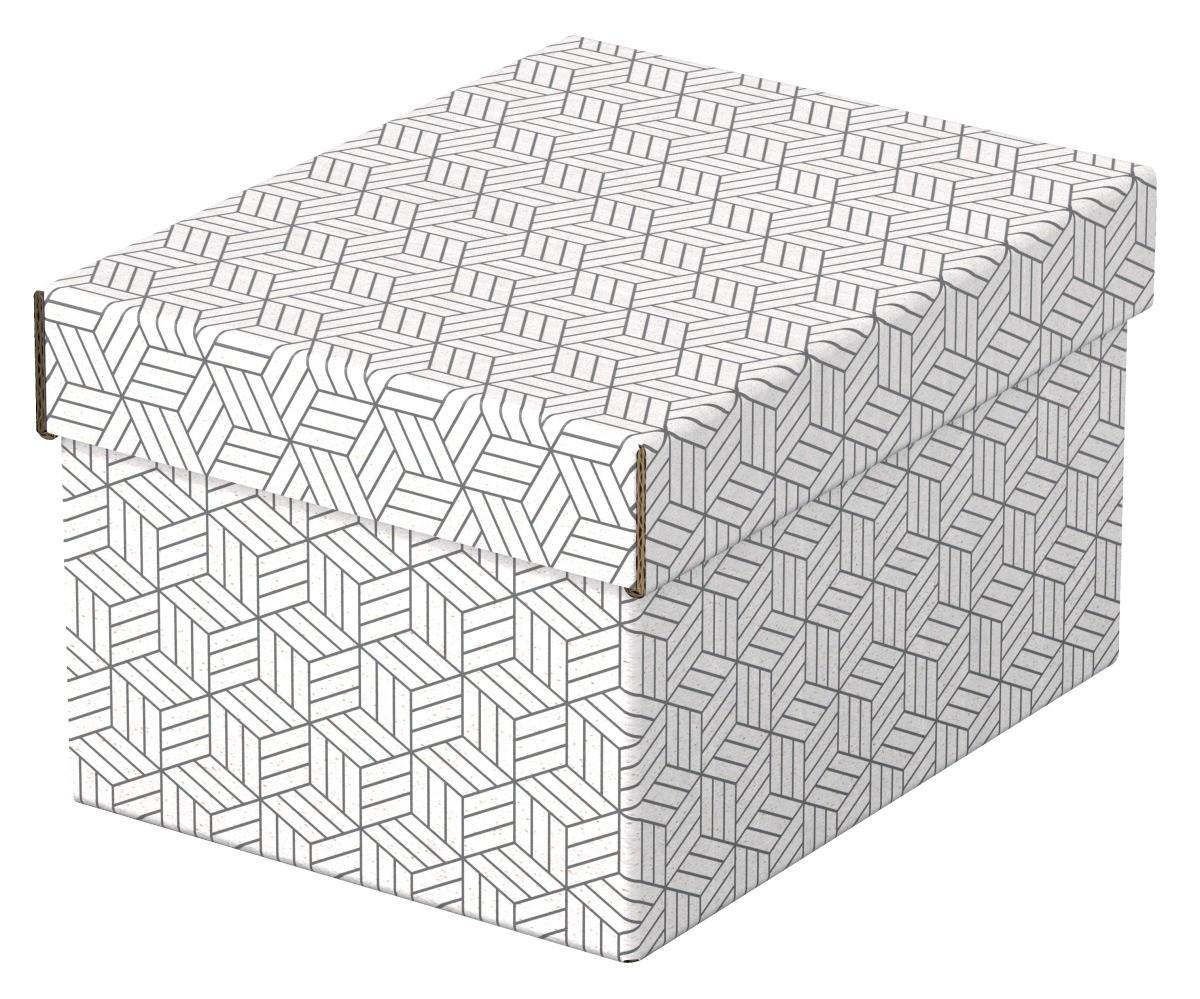 Stylové a moderní lepenkové úložné boxy se sundávacím víkem. Ideální pro zabalení dárků nebo pokud potřebujete doma rychle vytvořit úložný prostor. Sada tří boxů stejné velikosti, které můžete použít samostatně, uložit na polici nebo do krychlových úložných jednotek a skladovat v nich drobnosti, jako jsou fotografie nebo osobní dokumenty. Vše v nich bude úhledně zorganizované a snadno dohledatelné. A pokud box převážete stuhou, budete mít dárkovou krabičku! Až si obdarovaný svůj dárek rozbalí, může si krabičku ponechat k ukládání věcí, takže vlastně darujete 2 dárky v jednom. Vyrobeno z pevné 100% recyklované a 100% recyklovatelné vlnité lepenky s certifikací FSC. Otíratelný povrch má dvoubarevný geometrický design, který dodá vašemu ukládání věcí styl. Dodávají se v plochém balení a lze je rychle a snadno sestavit. Strany se během sestavování složí na sebe, což boxu dodá dvojnásobnou pevnost, aby byl pevný a jeho obsah dostatečně chráněný.