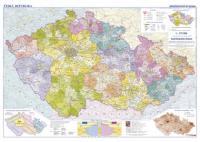 Nástěnná mapa zobrazuje aktuální administrativní členění České republiky. Území jednotlivých krajů a obcí s rozšířenou působností jsou od sebe přehledně barevně rozlišena. Mapa obsahuje také obce s pověřeným obecním úřadem. Samozřejmostí je také základní dálniční a silniční síť.