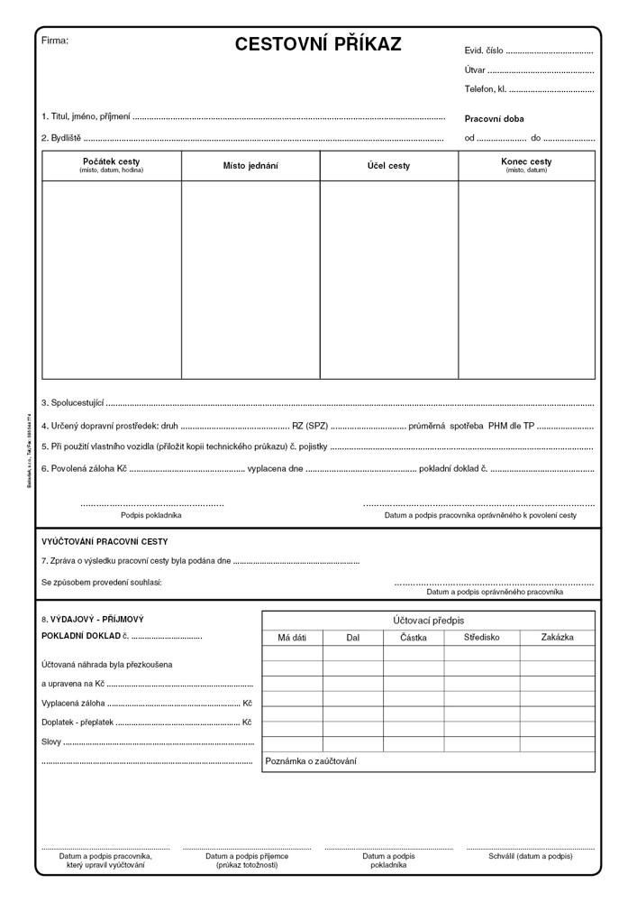 - Cestovní příkaz s vyúčtováním A4 (oboustranný) eko92 Kč/ ks76 Kč bez DPH