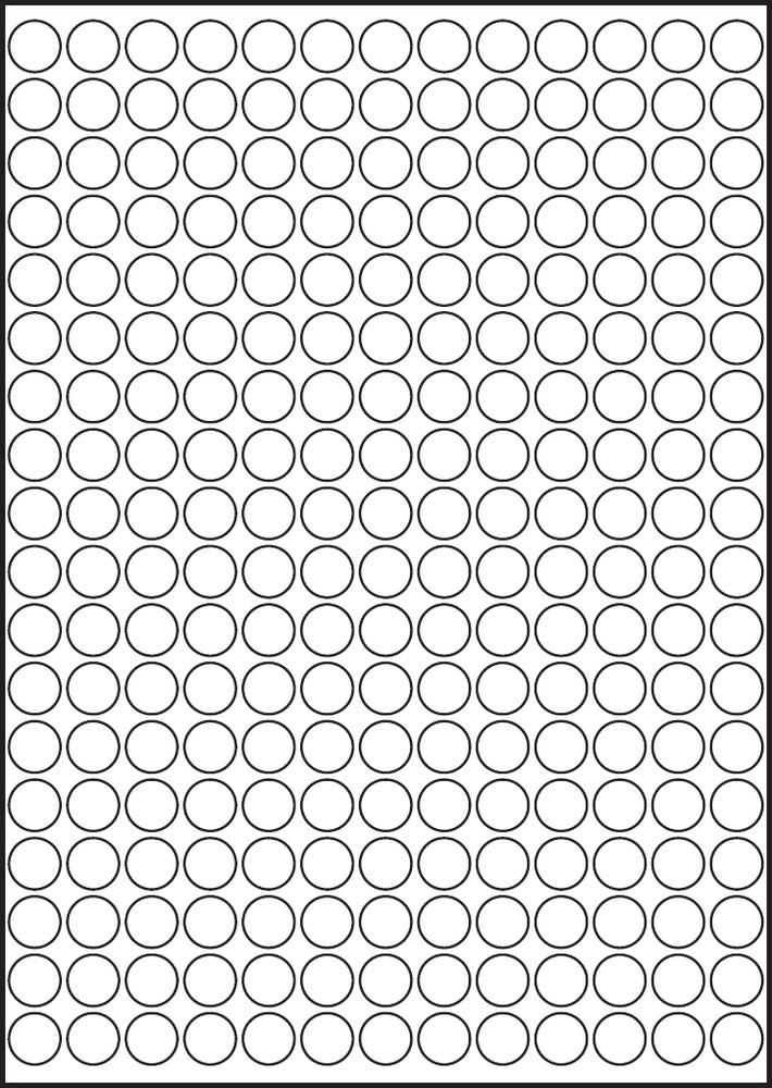 Samolepicí etikety na arších pro použití v laserových a inkoustových tiskárnách Rozměr: průměr 14 mm Počet etiket na archu: 234 Obsah balení: 100 archů