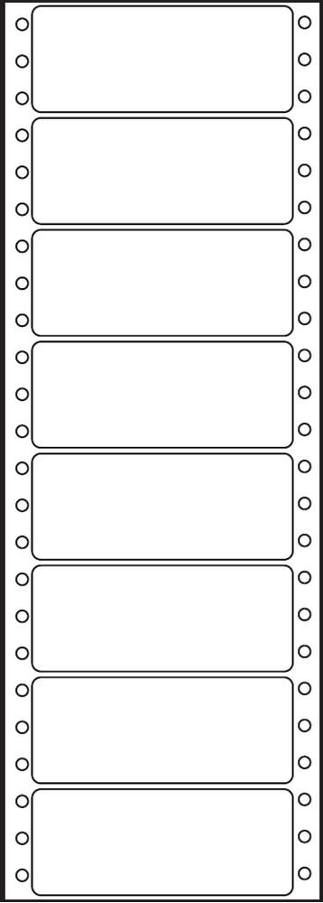 Počítačové samolepící etikety umístěné na "nekonečném" pásu skládaných listů (tzv. skladů) Jsou opatřeny postranní vodící perforací Určeny především pro potisk v mechanických počítačových tiskárnách Jsou dodávány standardně v bílé barvě Rozměr: 89 x 36,1 mm V balení 500 skladů