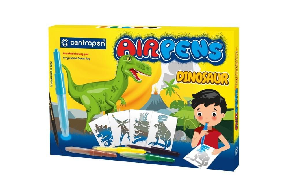 Foukací fixy na papír Zdravotně nezávadný inkoust Snadno smyvatelné a vypratelné 5 barevných odstínů, 1 černý fix 8 šablon s motivy dinosaurů 10 archů A4