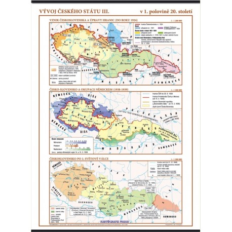 Nástěnná mapa na třech dílčích tematických mapách zobrazuje vývoj Československa od rozpadu Rakouska-Uherska do roku 1948. Mapky přehledně zobrazují územní zisky i ztráty během a po obou světových válkách i poválečné uspořádání tehdejšího státu, úpravy hranic a také hlavní směry postupů cizích vojsk při obsazování Československa v roce 1939.