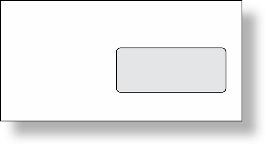 Obyčejná obálka s okénkem, s otvíráním na delší straně Rovná klopa, vlhčící Rozměry 110 x 220 Rozměr okénka: 104 x 42, umístění: zprava 15 mm, zdola 28 mm Balení: 1000 ks