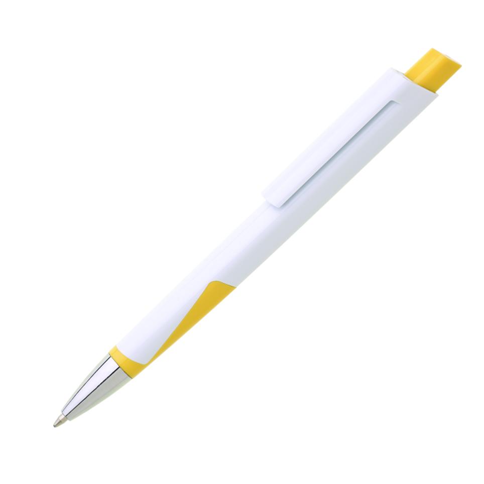 Plastové bílé pero se čtvercovým profilem a barevnými doplňky Ideální na UV potisk Náplň velkoobsahová, modře píšící celý popis