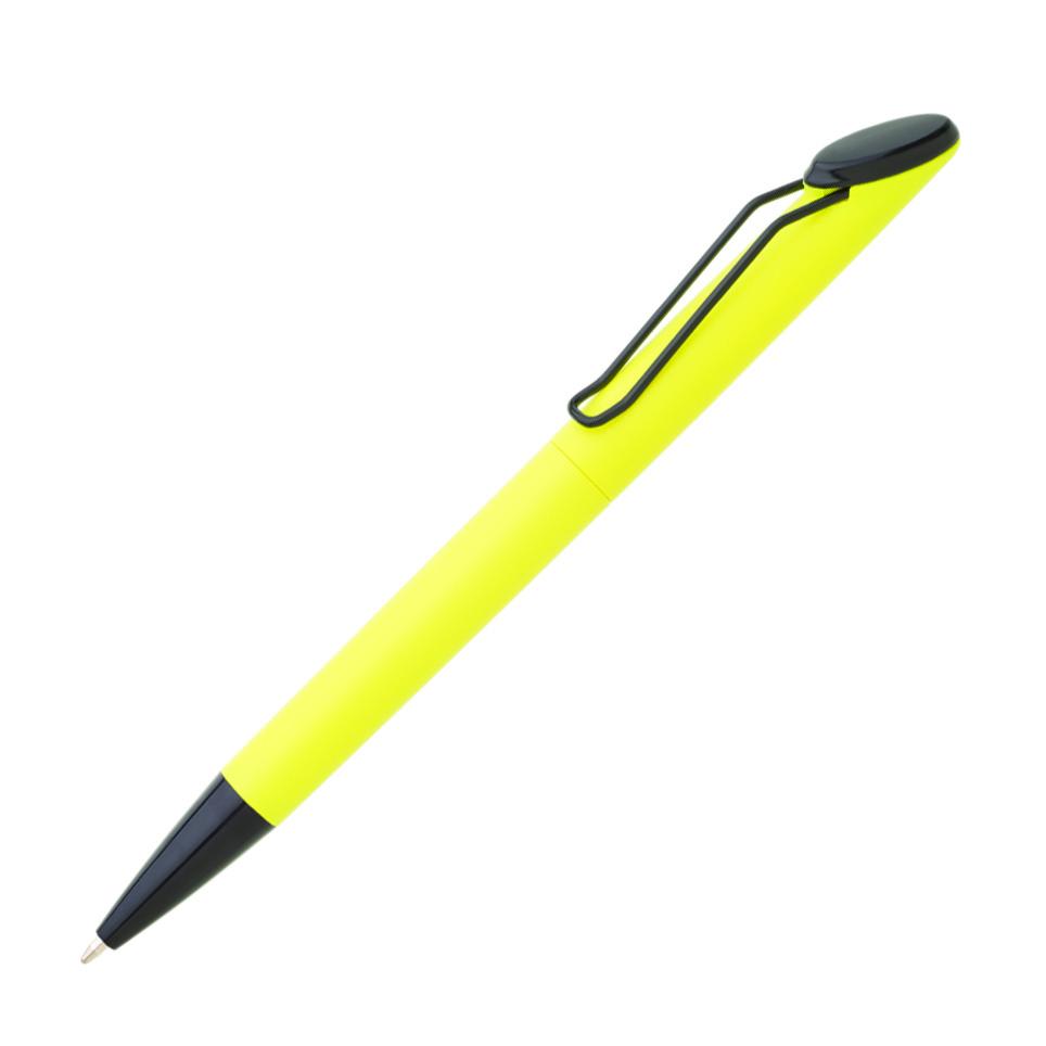 Plastová otočná propiska ARESTA v neonových barvách s černou špičkou a černým kovovým klipem Náplň velkoobsahová, modře píšící