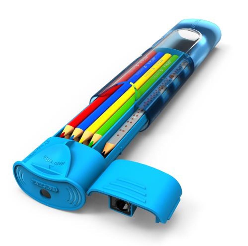 Multifunkční pouzdro, které obsahuje 12 trojhranných pastelek a 2 HB tužky s pryží Součástí je jednoduché ořezávátko s XL kontejnerem Inteligentní posun s pojistkou proti vysypání Mix 3 barev - modrá, žlutá a růžová
