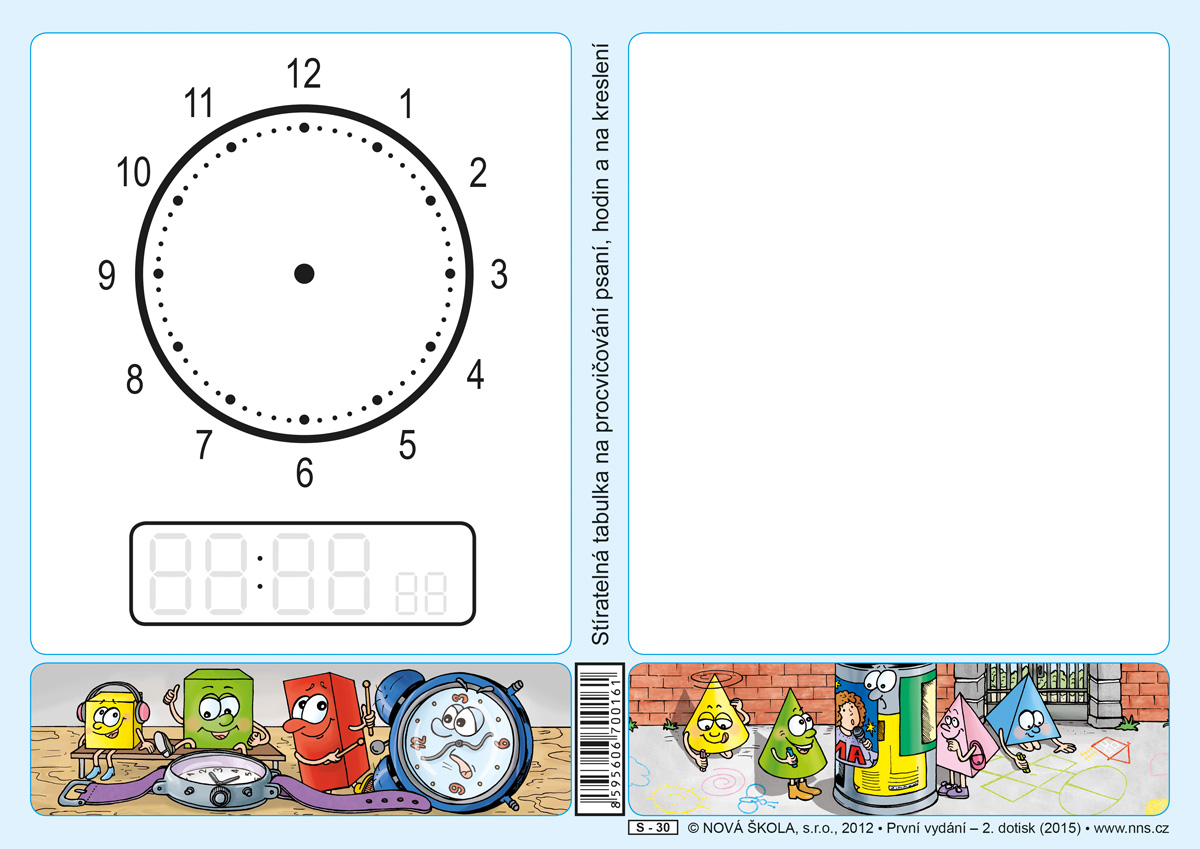 Stíratelná tabulka formátu A4 umožňuje žákům procvičovat psaní a hodiny. Navíc si mohou žáci na tabulku také kreslit. Stíratelnost funguje se speciálními fixy, jejichž stopu lze lehce setřít. Tabulka je vyrobena z papíru: 200g křída (obvyklý papír na výrobu obálek učebnic).