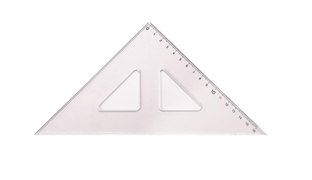 Průhledný plastový trojúhelník Stupnice 0 - 16 cm Úhly 90°, 45°, 45° Prodejní jednotka: 1 ks