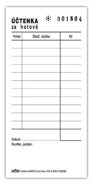 - Účtenka za hotové, 1/3 A5, číslovaná, blok 2 x 50 L, samopropisovací59 Kč/ ks48 Kč bez DPH