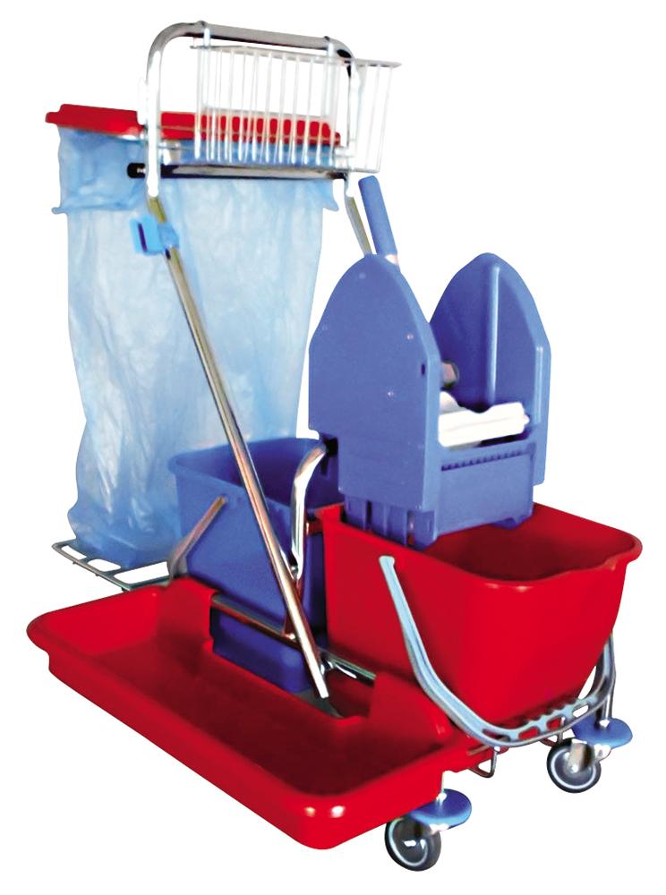 Profi úklidový vozík Odolný chromovaný rám Dvě vědra o objemu 17 l, ždímač, vanička, kovová rukojeť Držák pytle s víkem z odolného plastu Košík na úklidové pomůcky Podpěra mopu v dolní části vozíku Prodejní jednotka 1 ks