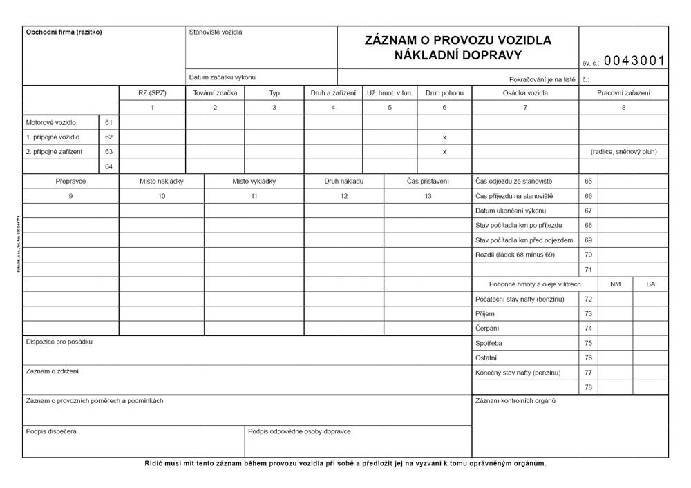 Záznam o provozu vozidla nákladní dopravy Formát A4 Tiskopis je číslovaný 1+1 Vyroben z recyklovaného hlazeného papíru Počet listů 50
