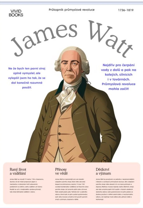 Tento plakát představuje Jamese Watta, jednoho z nejvýznamnějších průkopníků průmyslové revoluce. Jeho inovace v oblasti parních strojů znamenaly revoluci v průmyslu, dopravě a výrobě. Wattův vylepšený parní stroj se stal základem pro pohánění strojů v továrnách, čerpání vody z dolů a později i pro železniční a silniční dopravu.