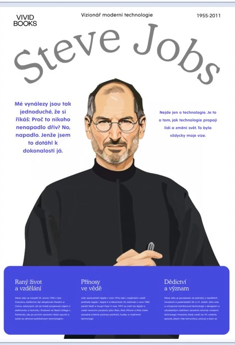 Tento plakát představuje Steva Jobse, jednoho z nejvýznamnějších inovátorů a podnikatelů moderní doby. Jobs spoluzaložil Apple a uvedl na trh revoluční produkty jako iMac, iPod, iPhone a iPad, které zásadně změnily technologický průmysl. Jeho vize propojení technologie a uživatelského zážitku měla zásadní vliv na komunikaci, práci a zábavu lidí po celém světě.