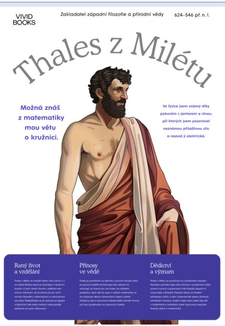 Nakladatelství: Vividbooks Katalogové č.: viv100134 “Možná znáš z matematiky mou větu o kružnici. Ve fyzice jsem známý díky pokusům s jantarem a vlnou, při kterých jsem pozoroval neznámou přitažlivou sílu a nazval ji elektrická.” – Thales z MilétuTento plakát představuje Thaleta z Milétu, jednoho z ... celý popis
