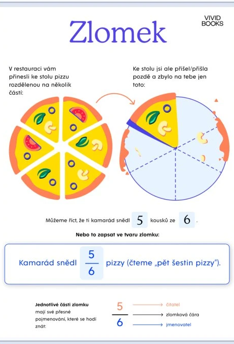 Tento plakát zábavně a srozumitelně vysvětluje základní princip zlomků na příkladu pizzy. Pomocí vizuálních ukázek se děti snadno naučí, jak zapsat zlomky a co znamenají jednotlivé části, jako je čitatel a jmenovatel. Plakát je navržen tak, aby žákům pomohl pochopit, jak zlomky fungují v reálném životě a jak je lze jednoduše vyjádřit.