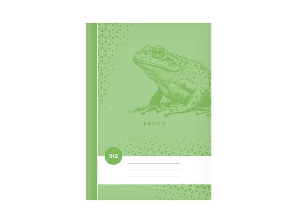 - Školní linkovaný sešit ve formátu A5, v zelené barvě, s motivem žáby, v deskách z křídového papíru