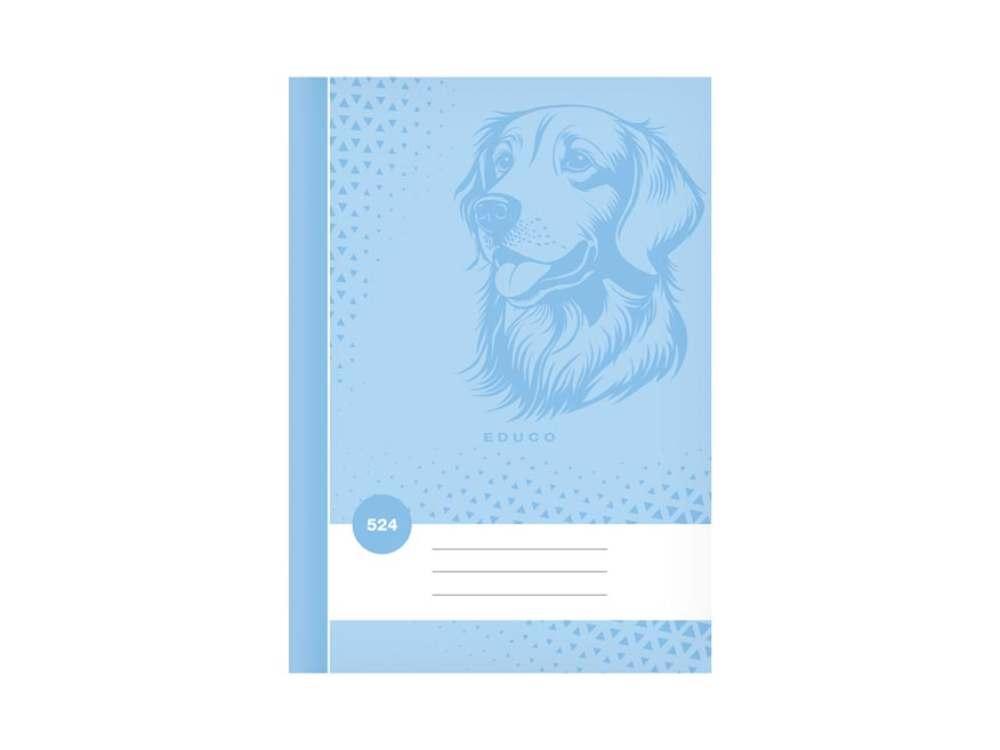 - Školní linkovaný sešit ve formátu A5, v modré barvě, s motivem psa, v deskách z křídového papíru